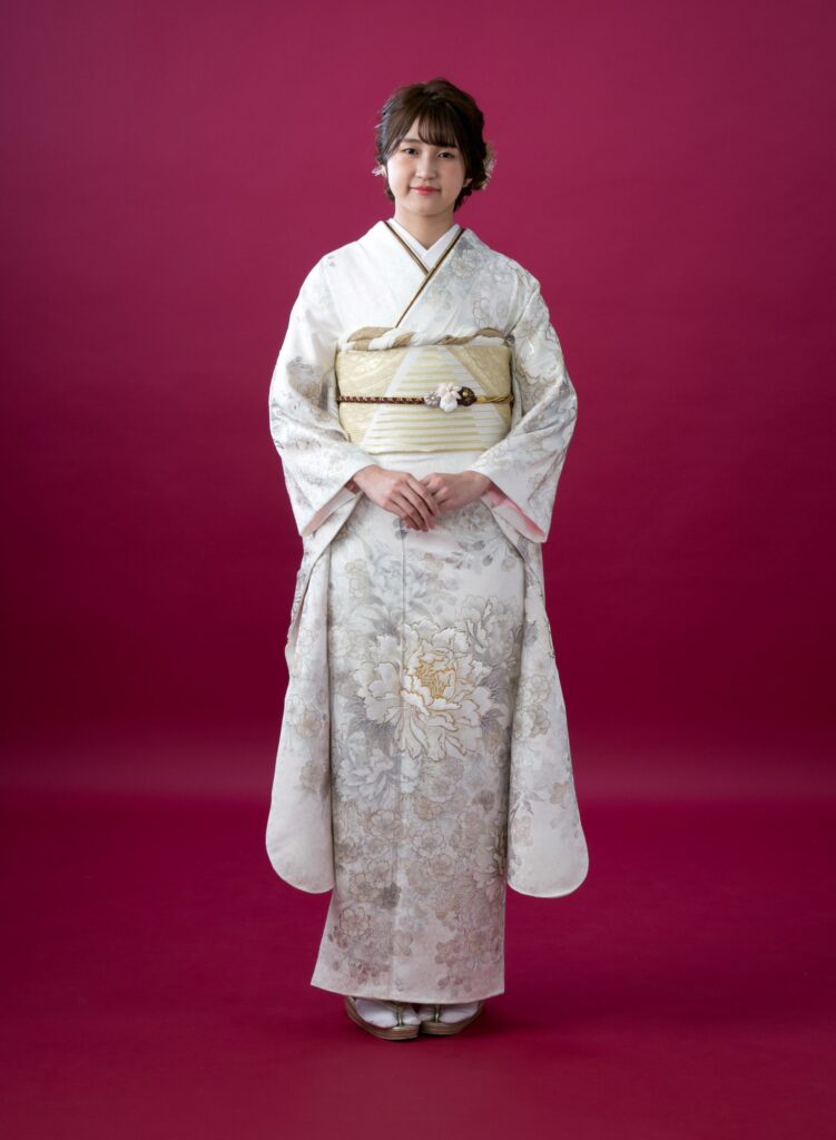 トレンドの白地の振袖。小物も同系色でまとめる事で統一感のあるコーディネートに。大人っぽくシンプルに着こなしたいお嬢様にお勧めの一着。