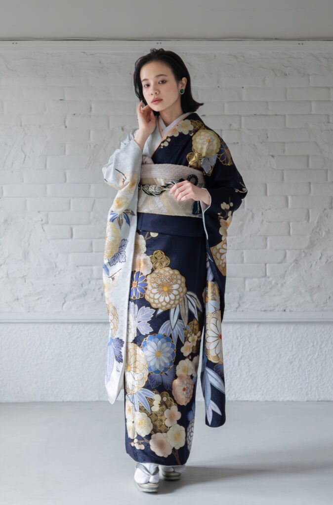 今人気の紺×白の振袖は、左右で地色が分かれているので見る角度で全く違う印象に。菊・梅・笹の古典柄も色のトーンを抑えることで大人っぽく着こなしていただけます。