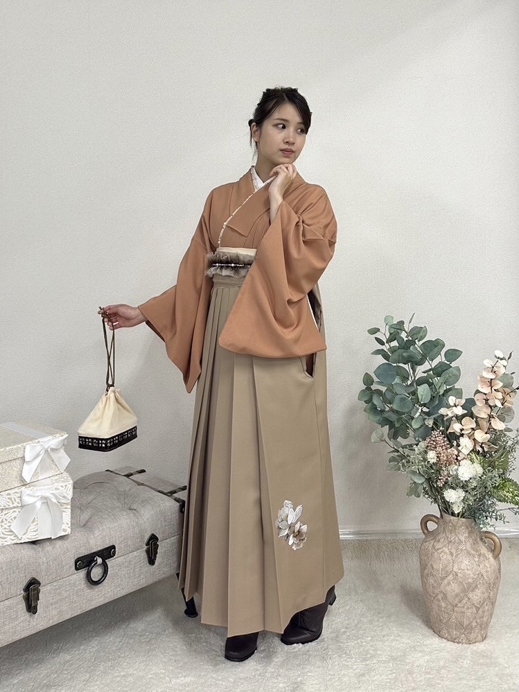 茶色とベージュのワントーンコーデが印象的な一着は、落ち着いた雰囲気がお好みの方にお勧め。袴の刺繍がワンポイントでお洒落さをプラスします。