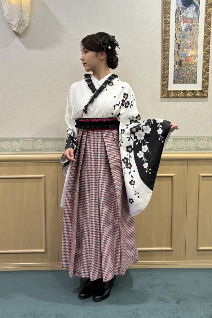 「誰かと一緒は嫌。」そんなお嬢様にお勧め。モノトーンの着物にピンクの千鳥柄の袴を合わせた個性的なコーディネートは、襟元とウエストの黒のフリルが華やかさをプラスします。