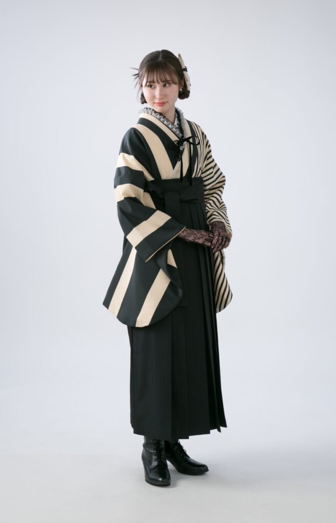 左右で太さの違うストライプを施したベージュと黒のシンプルで個性的な着物。見る角度で表情を変え、コーディネイトする袴でも印象がガラリと変わります。黒でシックにかっこ良く!ベージュで柔らかくより個性的に…へスタイル、小物で自分らしいコーディネイトをお楽しみ下さい。