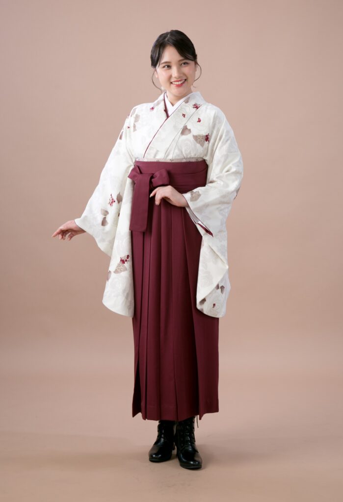 ベージュの地色に優しい色合いの薔薇を全体描いバーガンディカラーとグレーブラウンがアクセントとなり上品で大人っぽい印象に。バーガンディやブラウンの袴を合わせる事でトレンド感をプラスします。