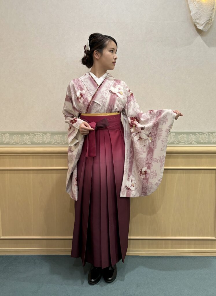 全体に描かれたくすみピンクの花柄が上品な大人の印象を与える一着。トーンを合わせたグラデーションの袴をコーディネートすることでワンランク上の装いに。